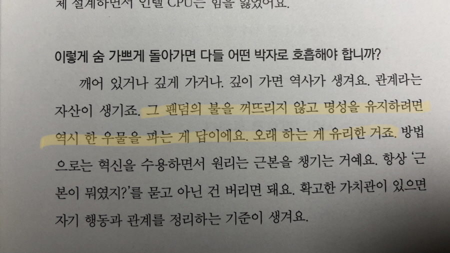 개인적으로 많이 헛갈리는 주장도 있다. 웨이브 콘텐츠 송길영 부사장은 현재는 '자기 콘텐츠'가 중요한 시점이고 그에 따르는 '진정성'이 반드시 필요하다고 언급한다. 그 와중에 이렇게 숨 막히는 속도에 어떻게 호흡하느냐는 질문에 "한 우물을 파"라는 대답은 그동안 이런저런 책에서 봐왔던 한 우물을 파다 보면 자기 무덤을 파게 된다는 맥락과는 많이 다르다. 튼튼한 본케와 다양한 부케가 필요한 시대라 생각했는데 그의 조언은 의외다. 그리고 어쩌면 당연한 것이겠지만 직원들의 창의성을 원하면 조직 문화를 바꾸라고 강조한다. 안 그러면 퇴근 후에만 창의성을 발휘하게 될 거라면서, 이 대목에서 빵 터졌다. 우리가 딱 그 조직이 아닌가.