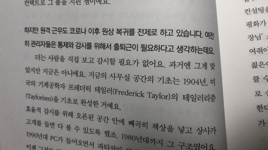게다가 우린 포스트 코로나를 꿈꾼다. 요즘에서야 위드 코로나를 조금씩 이야기하지만 실상은 예전과 같은 마스크 없는 삶을 꿈꾼다. 일상도 그렇지만 회사 역시 감시와 지시가 편한 예전의 시스템으로 회귀를 꿈꾸고 있는 관리자에게 저자의 일침처럼 '데이터가 있지 않느냐'라고 친절하게 알려 주고 싶은 심정이다.