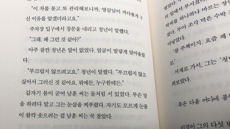 단숨에 읽었다. 내용이 방대한 세계관을 지닌 서사나 깊은 철학을 요구하는 소설이 아니긴 했지만 그럼에도 이리 빨려 드는 데는 분명 뭐가 있긴 있겠지 싶다. 내가 남훈 씨에게 너무 감정 이입을 한 게 아닌가 싶다가도 왠지 당연한 것일지도 모른다고 생각한다. 살짝 가부장적인 아버지이면서 나보다는 가족을 앞세워 앞만 보고 달려온 중년의 가장의 감정이 스펀지에 물 스미듯 마음을 무겁게 했다. 그렇게 한 남자의 개인사가 가정사를 지나 진짜 가족이 되어 가는 과정이 눈물 난다.
