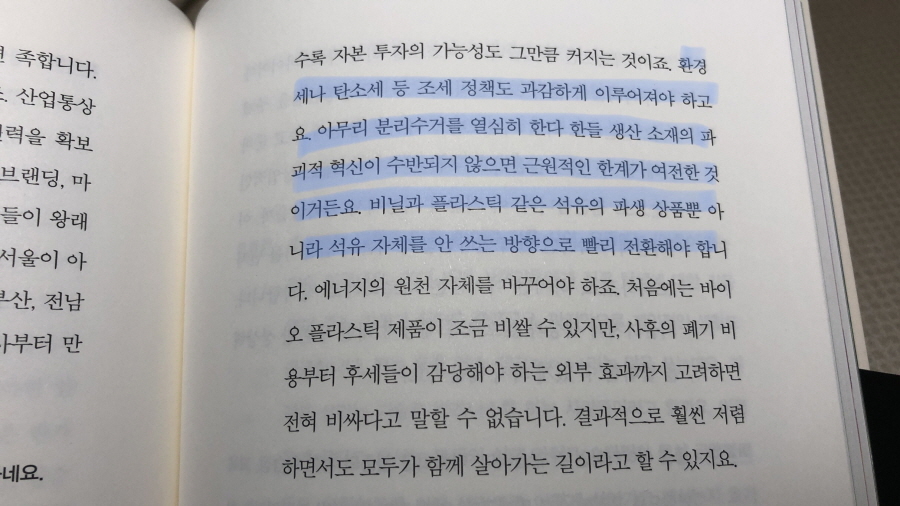 바다에서 해답을 찾는 마린이노베이션 차완영 대표의 이야기는 놀랍다. 하지만 마냥 긍정할 수 없는 것이 바이오 플라스틱의 활성화를 위해서는 결국 기존 플라스틱 산업을 규제해서 그 틈을 비집고 성장할 수밖에 없는 제한점이 있다고 설명하는 부분에서 '나 살자고 다른 사람 죽여야 하나?'라는 딜레마도 있겠다는 생각이 든다.