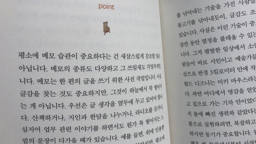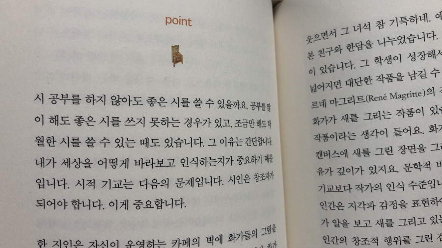 시인은 산문을 쓰고, 그 산문으로 시를 짓는 마음을 이야기합니다. 포인트라 하면서 말이죠. 그냥 글쓰기 수업이 될 정도입니다. 따뜻한 어투의 그의 말을 따라가다 보니 자연스레 제 말(글) 투도 그리되는 게 괜스레 기분 좋아집니다.