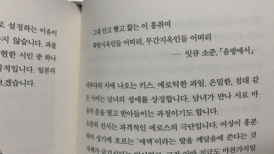 시인은 5가지 챕터에 29가지의 주제를 산문과 해설을 통해 시를 담은 마음을 이야기하고 있습니다. 마치 문학 수업을 받는 것처럼 인간과 철학에 대한 깊은 사유와 사랑과 용서 같은 농익은 감정들까지 뭔가 삶이 풍요로워진 것 같다고 하면 과장일까요? 게다가 저도 모르게 시인의 흉내를 내는 말투까지, 생경하지만 흠뻑 취한 시간이었습니다.