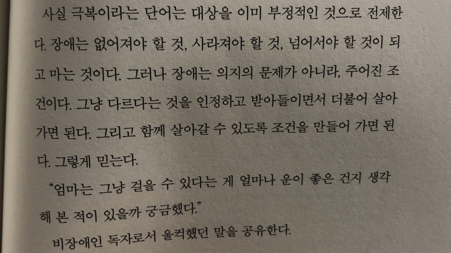 장애인을 '장애'에 가두지 않고 사람으로 바라보게 만드는 이 책을 많은 사람들이 읽었으면 싶다. 훌륭한 책이다.