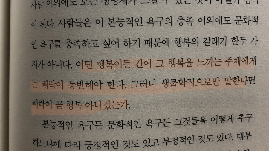쾌락을 동반할 때 행복이라는 저자의 말에 행복이 좀 새삼스러워진다. 쾌락을 추구하는 것이 인간의 자연스러운 본능일지 모르지만 그럴 때가 생물학적 행복이라니 부정하긴 어렵지만 왠지 외면하고 싶기도 하다.