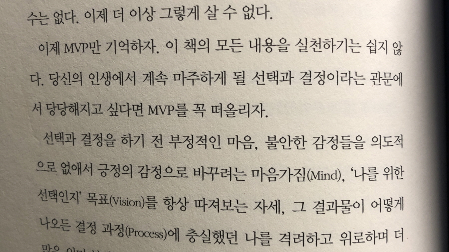 이 책은 현대인의 고질적 문제인 선택과 결정에 대한 효과적 해결책을 담고 있다. 거기에는 나만의 가치관과 주관을 갖고 멈추고, 생각하고, 천천히 결정하는 것이 필요하다고 조언한다. 그뿐만 아니라 이 모든 선택과 결정을 실천하는 방법으로 MVP를 소개하는데, 선택과 결정에 앞서 부정적인 마음을 긍정적으로 변화하게 하는 마음가짐(Mind), 나를 위한 선택인지 확인하는 목표(Visiono), 결과에 관계없이 과정을 중요하게 생각하는 결정과정(Process)을 삶의 태도로 제안한다.