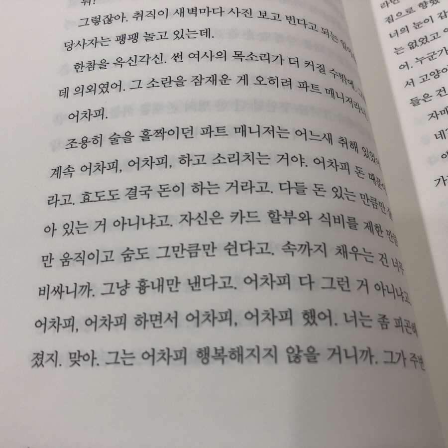 그리고 '어차피'라는 말이 이렇게 처연해도 될까, 싶었다. 어느 매장의 매니저인지는 모르지만 어쨌거나 그 매니저가 낮게 읊조렸던 소리는 책 속에서 크게 터져 나왔다. 다들 돈 있는 만큼만 살아 있는 거 아니냐, 라는 그의 술 취한 음색은 귀에 대고 소리치는 아우성만큼이나 속을 헤집는다. 누구나 '어차피' 사는 건 그런 거겠지만 더럽게 아프다.