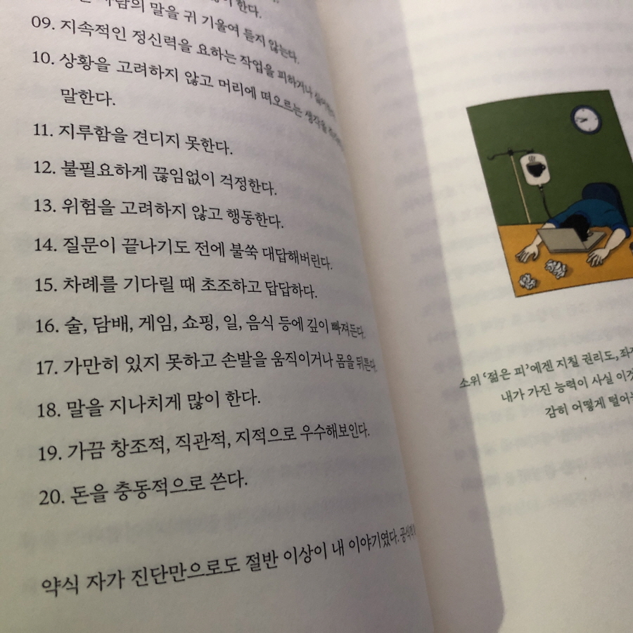 안은 전쟁터, 밖은 지옥인 이런 세상에서 성인 ADHD에서 자유로울 성인이 있을까. 회사 책상은 늘 무엇인지도 모를 서류들이 쌓여 업무를 재촉하지만 시작이 어렵다. 다들 그렇지 않을까. 그런 성인 ADHD 목록을 가볍게 훑다가, 예상은 했지만 실제가 되니 마음이 좀 무거워졌다. 쉽게 주의력이 날아 가거나, 다른 사람의 말에 귀를 기울이지 않게 되는 거나, 지속적인 정신력을 요하는 일은 피하는 거나, 말을 지나치게 많이 하거나, 가끔 아주 가끔 우수해 보이기도 하는 것들에 동의에 제청까지 하고 싶은 마음이다.