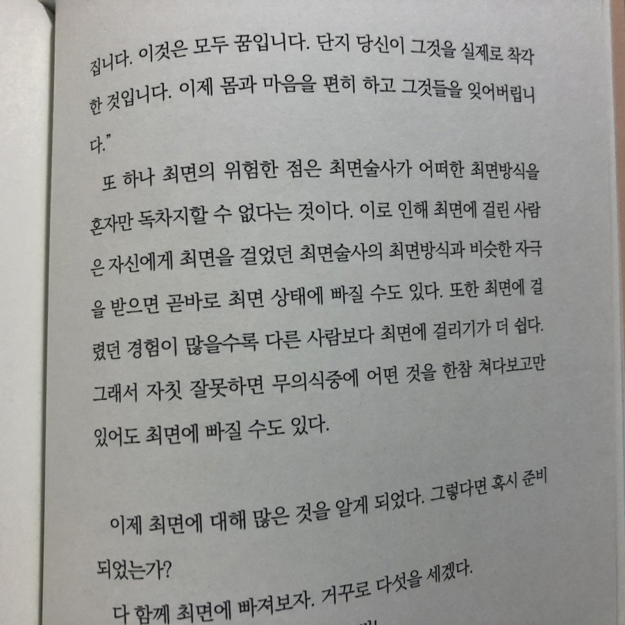 어쨌든 성인이 된 후에는 개인적으로 최면이 눈속임이라 믿는 편인데 그런 사람은 최면에 잘 걸리지 않는다는 저자의 설명이 왠지 아쉽기도 하고 맥이 빠졌다. 그런 경험도 재미있을 거라는 생각이지만 어쨌든 치료의 영역이니 가볍게 생각할 건 아닌 것 같다.