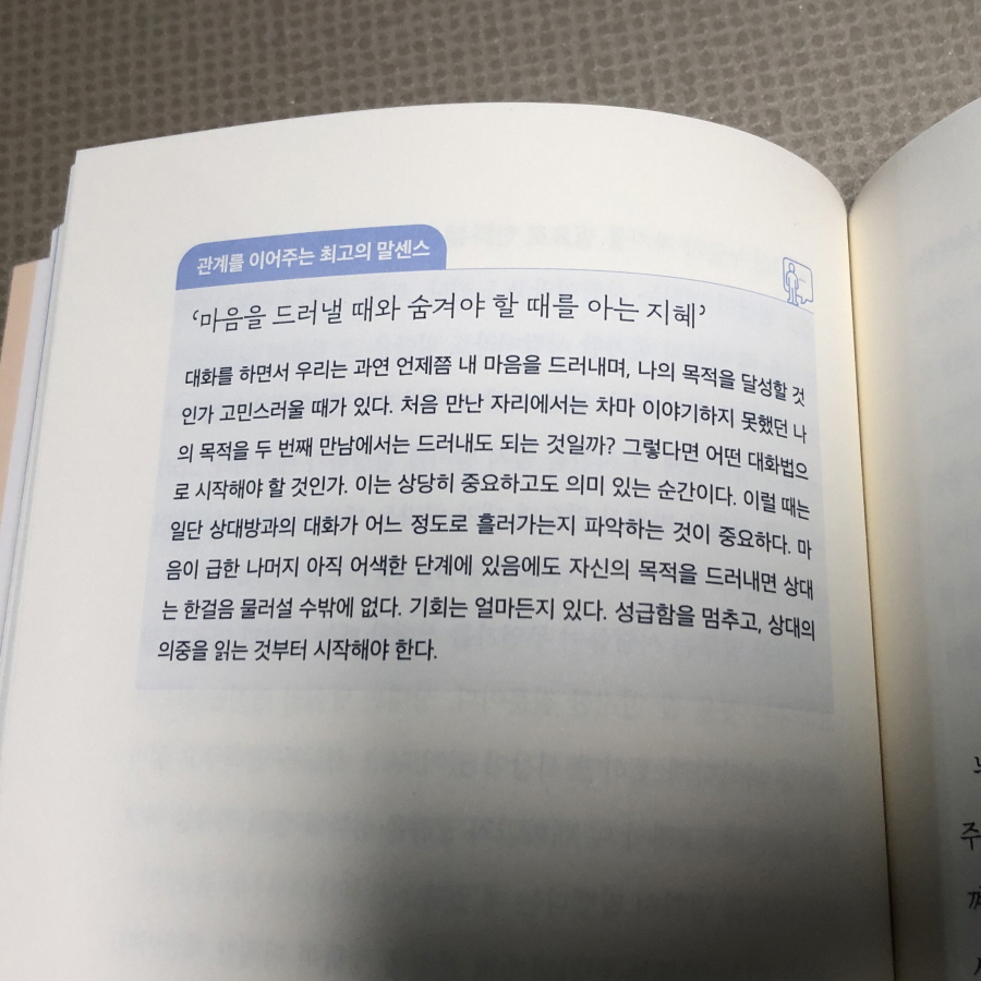 이어진 내용에 사과의 말 속에서 각자가 느끼는 포인트가 다르다는 설명은 밑줄 긋고 메모한다. 대화에서 경청은 분명 관계를 나은 방향으로 만든다고 믿는다. 또한 사과에도 이해관계를 살펴야 한다는 점 역시 맞는 말이라는 생각이 들었다. 또 대화에서 속마음을 감추는 방법에서 목적이나 이익을 곧바로 드러내기 보다 적절한 때를 봐서 드러내는 것도 지혜라고 설명하는데 직설적인 성격의 사람들에겐 속 터질 일일지도 모르겠다는 생각이 들어 피식했다.