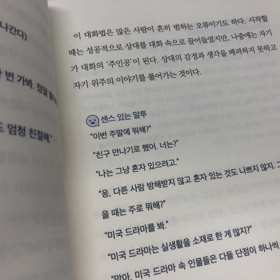 상대방과의 연결고리, 관심법, 적절한 칭찬, 부정적 감정을 경쟁하지 않을 것 등 대화에서 기억하면 좋을 유의미한 이야기가 쉬운 사례와 설명으로 줄줄 이어진다. 그리고 챕터 마지막에 "최고의 말센스"로 핵심을 한 번 더 정리한다. 상대방과의 대화에서, 특히 대화에 소극적인 사람과의 대화를 이어나가는 방법에 대한 설명은 주목할만 하다. 상대의 감정과 생각을 배려하지 못하고 자기 위주의 이야기를 풀어가는 것은 좋지 못하다고 지적한다. 이 부분은 특히 내가 자주 저지르는 일이라 뜨끔 했다.