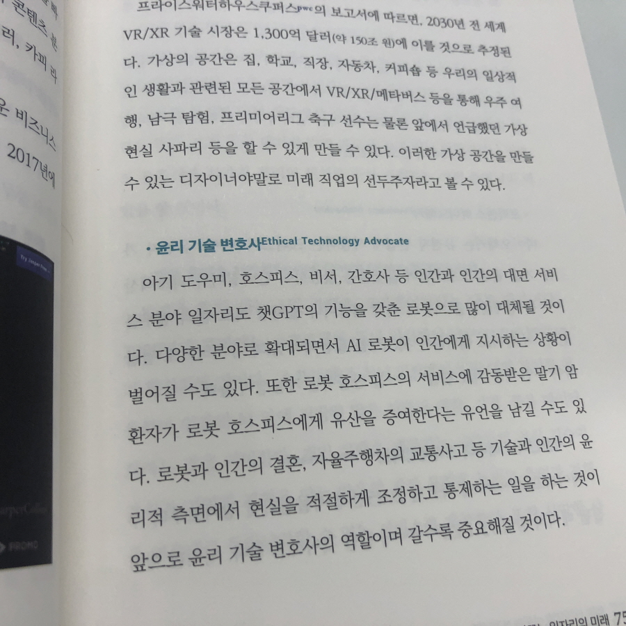 여기에 미래 유망 직군에 윤리기술변호사가 게 눈에 띄었다. 사회복지를 업으로 하고 있는 터라 대면 서비스가 기본인 사회복지는 기계의 영역이 아니라는 이야기를 들어 살짝 안심이 되긴 했다. 한데 사회복지가 아직은 기회의 직군이기는 하지만 챗GPT 발전에 따라 이 분야도 로봇이 인간에게 업무 지시를 하는 상황을 예견한다. 이때 발생할 수 있는 윤리적 딜레마를 기계가 해결한다니 입맛이 아주 쓰다.