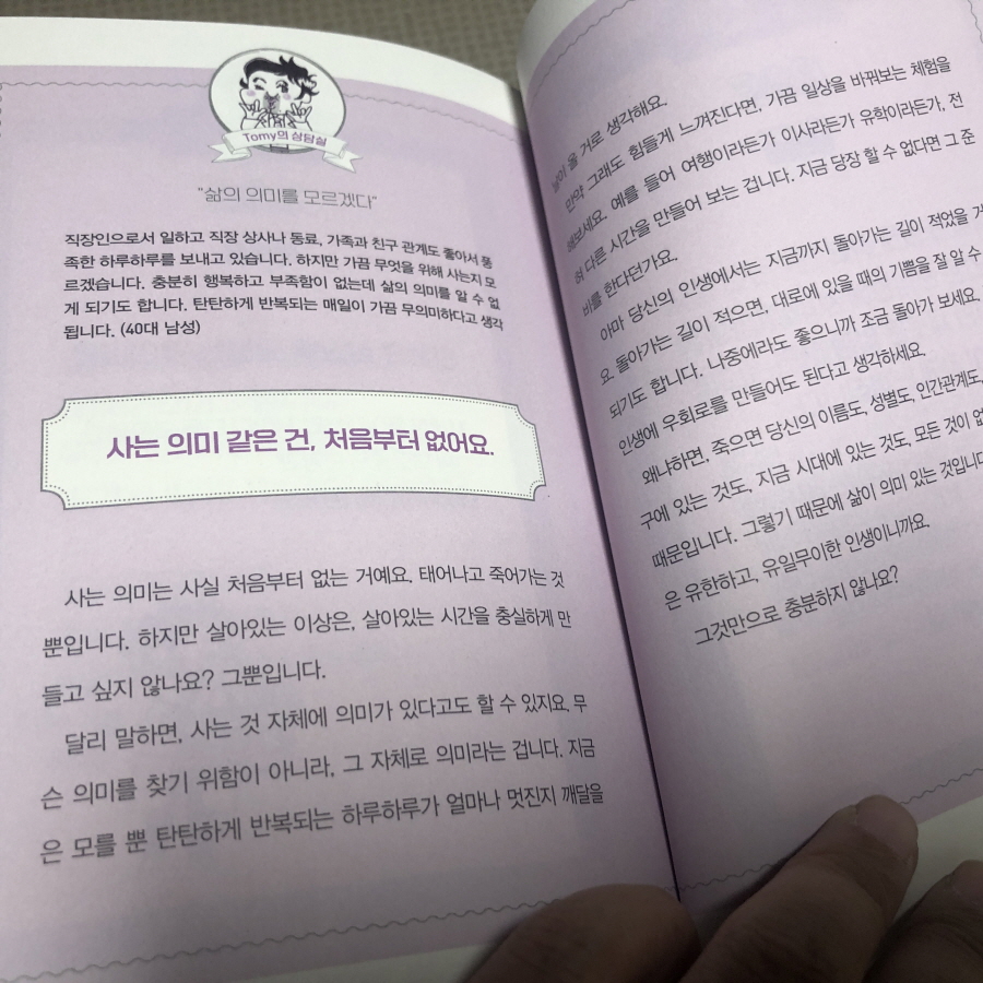 솔직히 책은 깊이 있는 상담 도서라고 하기는 어렵다. 하지만 짧은 조언은 그에 못지 않게 가슴에 와닿는다. 책장은 쉽게 넘길 수 있어도 그 안에 담긴 메시지는 쉽게 지나칠 수 없다.