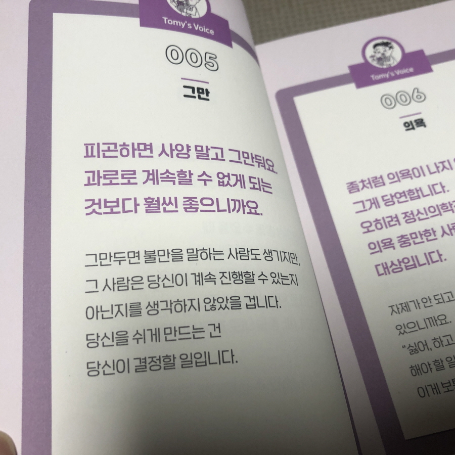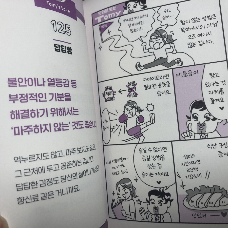 생각했던 구구절절한 활자 상담이 아니다. 짧은 메시지 그래서 텅텅 빈 것 같은 여백의 미를 갖춘 읽기 편한 책이다. 내용은 순간적으로 갖게 되는 감정에서부터 오랜 시간을 끙끙 앓고서도 해결되지 않는 찝찝한 감정까지 총 망라해 아주 짧은 조언으로 감정이나 고민을 날려 준다.
