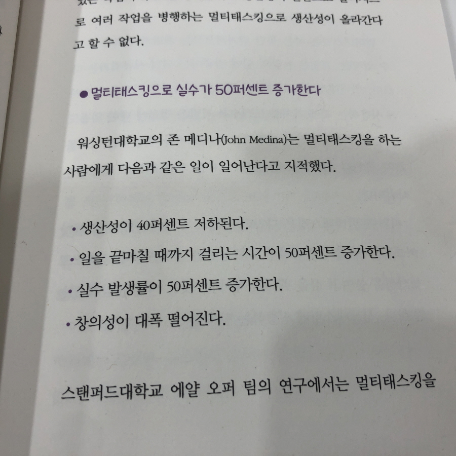 학창 시절에 이어폰을 꽂고 음악을 들으며 공부하는 친구가 부러웠다. 나는 공부는 커녕 책도 읽지 못했다. 요즘은 집중력이 떨어져 한 가지 일도 제대로 못하는 싱글태스커라고 하기도 어정쩡하다. 어쨌거나 동시에 여러 가지 일을 하는 사람이 부러웠는데 저자의 이야기를 듣자니 그럴 필요가 없지만 그래도 그런 사람들이 있어 보이는 건 어쩔 수 없다.