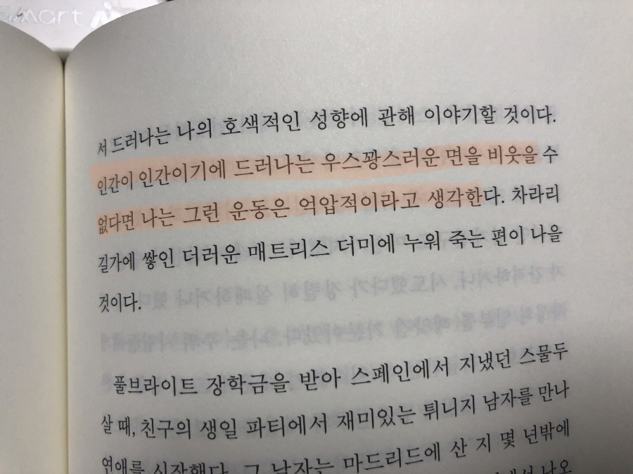 읽기 시작하고 얼마 되지 않아 '내가 이걸 읽고 앉아 있어야 하나?'라는 생각이 들 만큼 그의 질의 안녕과 HIV에 걸려 죽으면 집안 망신이라는 둥 시답지 않은 농담이 페이지를 채우는 동안 나는 세상 모든 HIV 유병자가 들었다면 솔찬히 마상을 입을 수도 있겠다는 생각과 아울러 좀 삐딱한 시선이 되고 말았다.