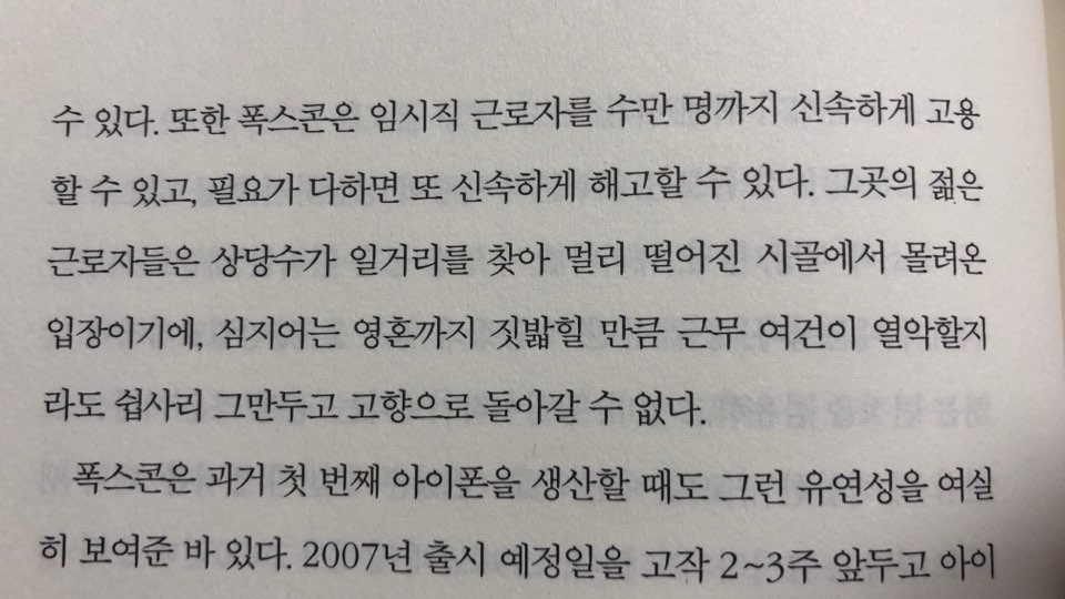 이런 생각은 저자 역시도 했던지 팀의 업적을 신이 난 듯 소개한다. 쿡의 유통방식 개선이나 아웃소싱에 대한 발군의 실력을 소개한다. 하지만 중국 폭스콘의 기업 운영방식을 말 그대로 기업 윤리가 바닥인 회사처럼 비친다. 물론 뒤에서 쿡의 기업 윤리와 맞지 않았던 폭스콘을 두고 신랄하게 비판하고 노동환경을 개선하도록 노력하는 쿡의 기업 윤리를 포장한다. 그런데 이런 포장에 잡스의 기업윤리가 정반대였는 일방적인 표현은 내용은 좀 불편했다.