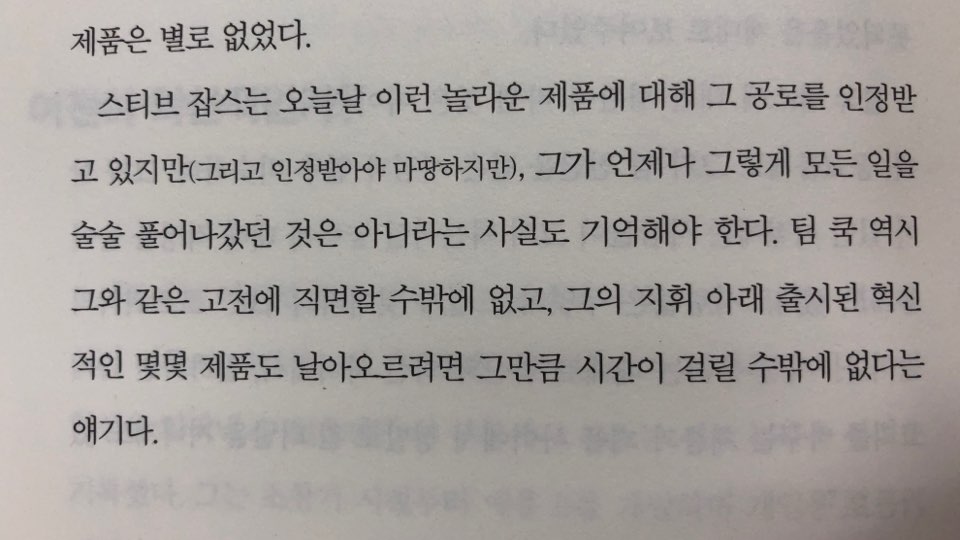 이 모든 내용이 쿡이 애플에서 이뤄낸 성과가 사실일지라도 딱 한가지 애플이 고객의 경형을 중시하는 고객 중심의 가치관을 가졌다는 내용엔 고개가 갸우뚱 해진다. 나 역시 애플 기기를 사용하는 유저로 대한민국에서 판매나 서비스는 분명 고객 중심이 아닐뿐더러 신제품 출시 이벤트는 이웃 나라들과도 차별이 심하지 않은가.