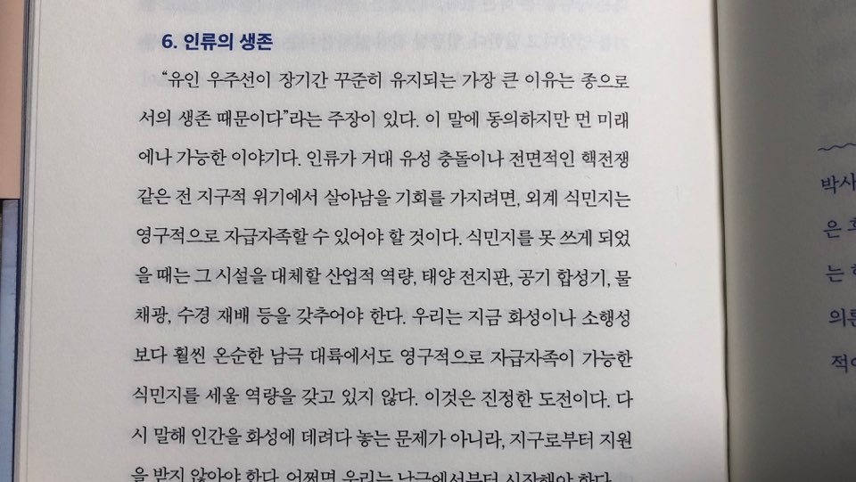 흥미로운 챕터는 19장 '유인 우주선에 반대한다'라는 그동안 일관되게 유인 우주선에 대해 부정적 시각을 피력한 그의 논점을 과학 저널 <우주 정책>에 기고한 내용을 토대로 이 책에서는 6가지 이유를 들어 설명하고 있는 내용이었다. 특히 마지막 6번째 '인류의 생존'으로의 유인 우주선의 역할이라는 것은 저자의 말처럼 외계 식민지에서의 자급자족이 가능한 시점이라는 점에 공감한다. 영화 마션에서 마크가 보여준 화성에서의 자급자족은 결국 포기하지 않으면 살아남을 수 있다는 메시지지만 실은 아직 그럴만한 역량을 갖추지 못했음을 인정하게 된다.