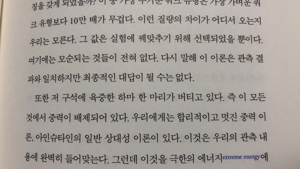 에세이라는 말에 너무 가볍게 생각한 걸까. 물리학에 관한 전문적인 내용도 내용이지만 과학, 특히 저자의 전문 분야인 이론 물리학에 문외한 독자를 고려한 친절한 내용은 아니다. 게다가 다소 정치적 신념이나 견해가 많다. 내용 자체도 무거운데 번역(뜬금없는 하마 한 마리라니) 역시 전문적이고 딱딱해 자주 책장을 덮어야 했다. 과학적 지식이 없는 내게는 우주는 과연 먼 이야기일 뿐일지도 모르겠다.