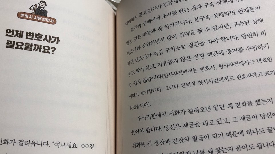 '법률 상식 포인트'와 챕터가 끝날 때 '변호사 사용설명서'를 통해 어떤 때 적절하게 변호사의 도움이 필요한지, 변호와 관련된 알아두면 피가 되고 살이 되는 깨알 상식이 가득하다. 아무리 저자가 쫄지 말라고 해도 형사가 전화해서 나오라고 하면 세금을 무진장 많이 낸다 한들 쫄지 않기는 힘들지 않을까? 변호사가 그럴 필요가 없다고 한들 죄가 없어도 우선 쫄게 뻔하다. 그대는 변호사니까 그럴 수 있는 거고.