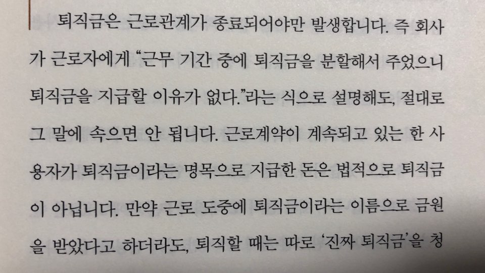 그런 쓸데없는(?) 부분을 저자가 꼼꼼히 짚어주는 부분은 살짝 억울함을 줬다. 저자가 말한 과거라는 시간적 부분은 그동안 대부분 내가 일해 온 시간이었고 이 중 입사하고 "첫해는 휴가가 없다"라는 말에 그런 줄 알았고, 회사가 월급제에서 연봉제로 바뀌던 시기에는 "퇴직금은 연봉에 포함됐다."라고 해서 그런가 보다 했더랬다. 게다가 8개월 치 월급을 받지 못하고 사장은 소리도 없이 폐업처리하고 해외로 튀었다.
