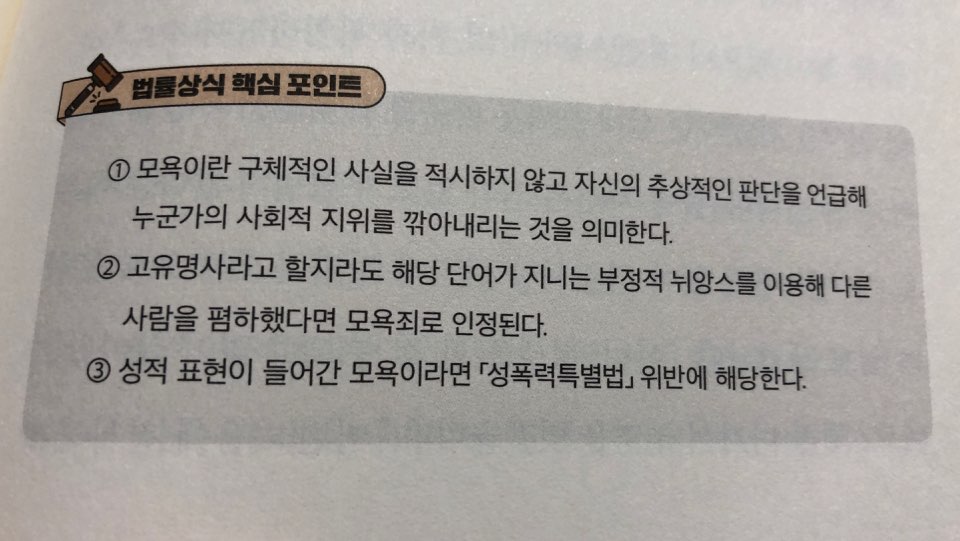 내용 중에 살짝 등에 식은땀이 날 정도로 식겁한 내용이 있었는데 다름 아닌 모욕죄다. 무심코 썼던 말 중에 "걔 또라이 아냐?"라거나 양아치 같은 단어를 빈번하게 사용하곤 하는데 이 말은 '구체적인 사실을 적시하지 않고 추상적인 표현을 사용해 누군가의 인격을 깎아내리거나 경멸하는 경우를 의미'한다는 법률에 비추어 볼 때 나는 상대방에게 모욕을 일삼는 인간이었다니 깜짝 놀랐다.