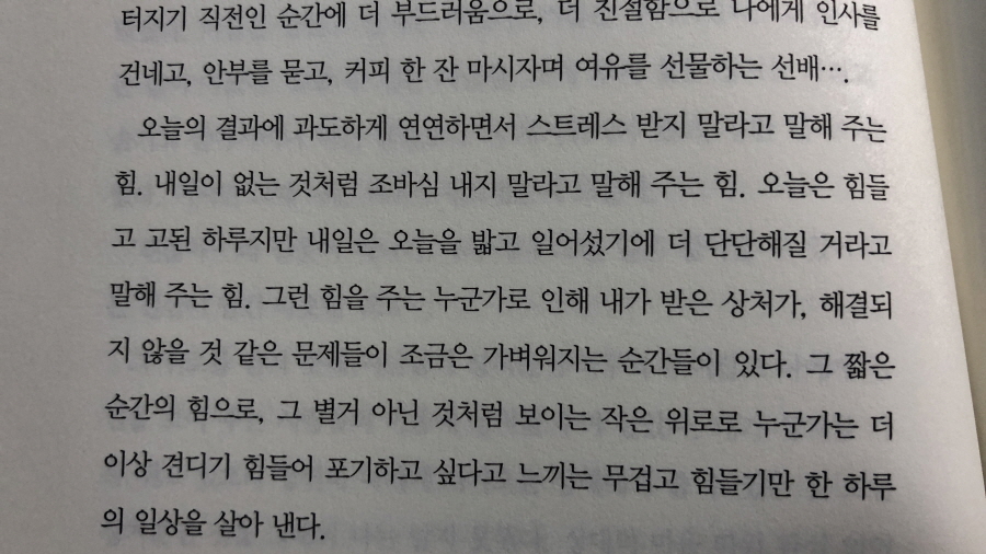 글쓰기 책이라 생각했는데 아니다. 글이 가진 치유의 힘에 대한 책이다. 다만 이렇게 치유의 힘을 갖기 위해 선행되어야 할 것에 대한 자기 고백적 이야기가 담겼다. 작가가 작가로서의 꿈을 이루기 전의 상처가 곪고 터지고 아물기까지, 아니 어쩌면 작가가 이야기한 것처럼 상처는 아물어도 흔적이 남는다는 말이 아직 익지 않은 감을 우적 씹었을 때처럼 떫디 떫지만 어쨌거나 조금은 덜 아픈 현재까지의 과정을 담았다. 긴 여정처럼 느껴질 수도 있겠다.