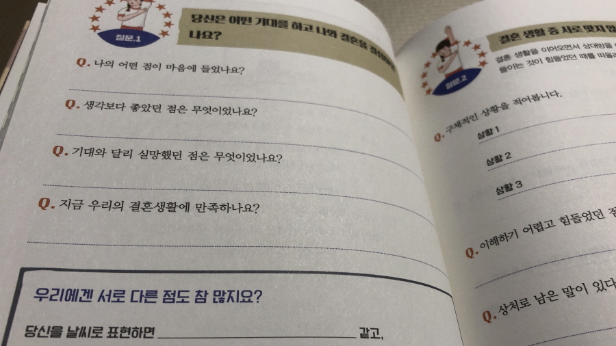 책이 시키는 대로 셀프 문답을 하며 빈 여백을 물끄러미 바라보다 웃기게도 울컥하는 통에 답답했던 마음이 조금은 덜어지기도 했었다. 이젠 나만큼이나 분노 조절 못하고 있는 아내의 마음을 들여다보기로 했다.