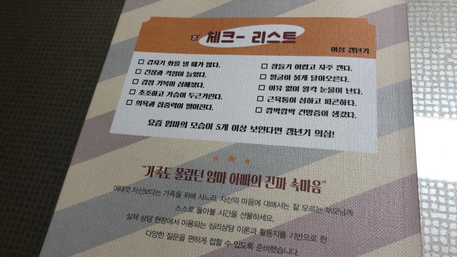 이 책, 엄마 편도 마찬가지로 총 15장으로 구성되어 있다. 자녀의 물음, 배우자, 자신의 질문을 스스로에게 묻고 답하며 자신의 마음 상태를 좀 더 객관적으로 들여다보게 돕는다. 딱히 갱년기는 어떻고 대처는 어떻게 극복할 수 있는지처럼 어떤 처방을 위한 지침서 같은 건 아니다. 그냥 생각고 적으면서 나를 들여다보는 시간을 통해 자신을 이해하면서 위안을 얻는 시간이랄까.