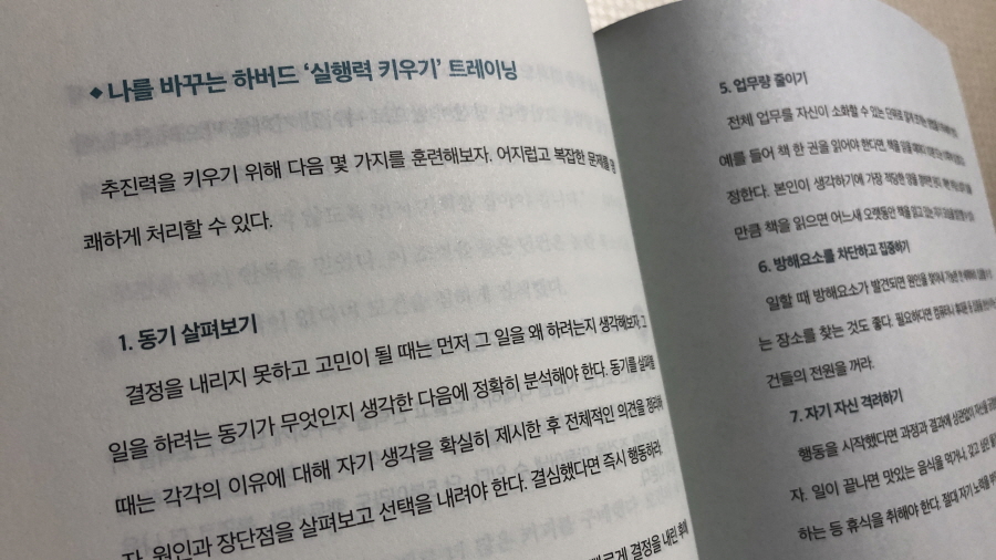 좀 더 나은 삶을 설계하기 위한 시작으로 자기 관리의 중요성을 깨닫게 한다. '아는 것과 깨닫는 것'의 차이는 하늘과 땅 차이라던데 암튼 이 책은 충동, 두려움, 잠재력, 습관, 인내, 의지, 독립성, 책임감 등의 실행력을 키우기 위한 실천적 방법과 아울러 감성, 관대함이나 포기 같은 감정 다스리기와 계획, 시간, 스트레스 관리와 대처법까지 어찌 보면 방대 양을 담고 있다. 그냥 하버드 도서관 복판에 서있는 느낌이다.