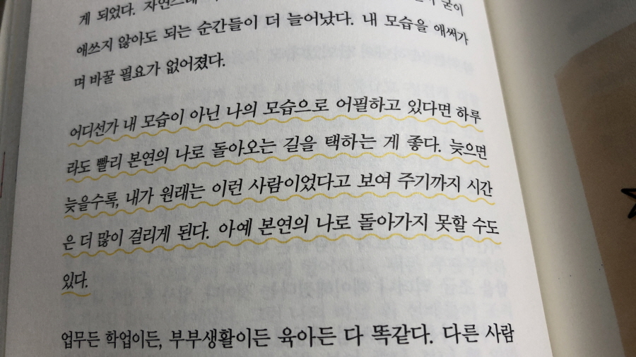 어쨌거나 친구 많고 대장 노릇하던 극한의 외향적이었던 내가 목이 부러진 후 조용히 혼자만의 시간을 가져야 하는 내향적으로 바뀌었다. 그런데 원래 성격은 또 어디로 간 건 아니라서 안팎이 다른 채로 사람들에 따라 적당히 스며들며 산다. 이렇게 '척'하거나 다른 '채'로 사는 일은 그의 말대로 많이 지치고 힘들다. 어느 순간 내가 어떤 모습인지 구분이 안 될 때가 있어 참 많이 공감됐다.