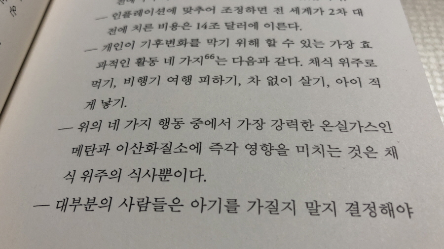 저자는 이렇게 전 지구적으로 위기감이 높아지기만 하는 기후변화에 여전히 우리는 고기를 탐하고 그런 우리를 볼모로 축산업은 기계화되며 그래서 가축들은 살기 위해 엄청난 메탄을 뿜어내고 지구는 뜨거워지는데 당신은 지금 어디에 있느냐고 질문한다.