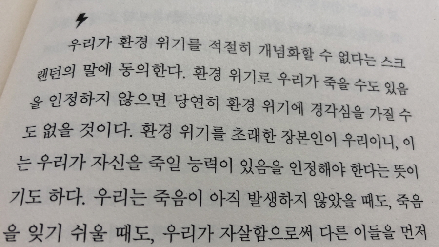 "기후변화에 대한 미국의 무관심을 일종의 자살로 본다면, 우리의 자살은 그로 인해 죽게 될 사람들이 아마도 우리가 아닐 거라는 사실 때문에 더 소름 끼친다." p222