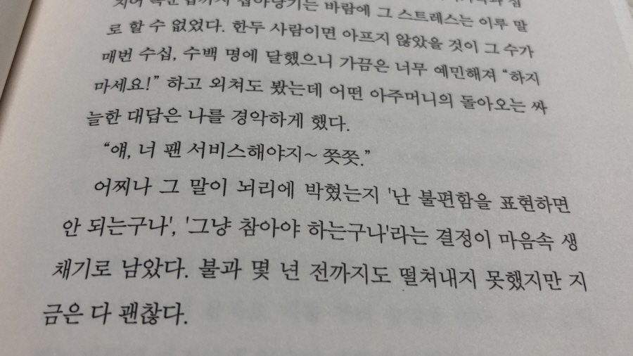 뭐랄까, 대화하는 것 같지는 않고 그냥 옆에서 자신의 이야기를 읊조리는 듯하다. 살짝 낮은 톤으로 끊기지 않게 계속 웅얼거린다. 살짝 고개를 숙였을지 모르겠다. 딱히 눈도 마주칠 누군가가 없기에 그저 누구라도 들어주길 바라는 마음을 담고 그렇게 느린 보폭으로 자신과 발을 맞추며 걷기를 바라는 마음으로 그렇게 책이 말하는 듯하다.
