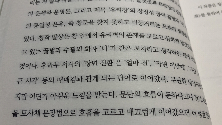 밖의 세상에서 실내로 날아든 벌이 열린 문을 찾지 못해 버둥대는 모습을 보고 이런 글을 쓸 수 있다니 부럽기만 하다. 여기에 평론을 읽으면 더 깊은 심오함은 덤으로 온다. 이 책이 독특하고 주목해야 할 부분은 수필을 문학적 장르나 이론으로서의 수필로 소개하는 것으로 끝내는 것이 아니라 수필을 하나의 장르로 묶이지 않는, 시이기도 하고 산문이기도 한 그러면서 다양한 구성이 가능하다는 설명은 그저 수필이 수필로 이해하는 게 아쉬울 정도다.