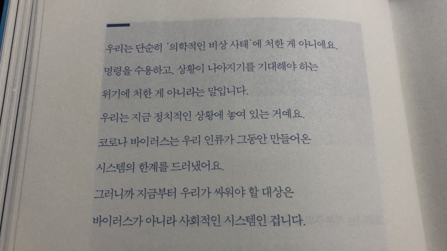"세상에는 여전히 자본주의를 신봉하는 사람이 많습니다. 자본주 체제에 문제가 있더라도 다시 잘 고쳐서 써보겠다고 생각하는 사람들 말입니다. 그런데 그건 불가능한 이야기입니다. 낡고 오래된 자본주의로는 결코 정상성을 회복할 수 없다고 생각해요." p175