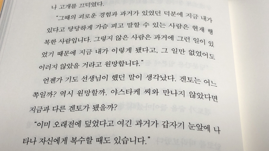 영재 소릴 듣던 하지만 지금은 백수 소리를 듣는 겐토의 여전함도 역시 반갑다. 그런 겐토가 부모와 자식에 대한 이야기는 밑줄이 쳐진 것처럼 도드라져 가슴에 박혔다. 나는 부모와도 자식과도 그렇다. 괜히 코끝이 찡해져 난감했다.