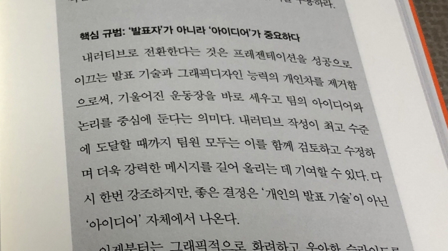 "내러티브 문서 그 자체가 진정으로 위대한 발견이었다. 우리는 엑셀과 파워포인트를 집어던지면서 '계량적이어야 하고' '시각적이어야 한다'라는 욕구와 유혹에서 벗어날 수 있었다. 아이디어가 있으면 내러티브 문서에 쓰기만 하면 됐다." 198쪽