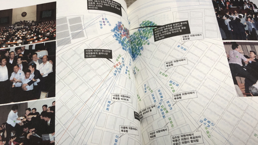 궁금하다. 몇 페이지 읽는 동안 기술의 이면을 이야기하려는 의도가 짐작됐다. '길'로 시작한 아날로그가 GPS로 축약되면서 디지털화된다. 그리고 그것이 일상이 될 때 그것들의 지배력에 압도되리라는 예측은 더 이상 무시하기 어려워진다. 도대체 작가가 이야기하는 이 프로젝트란 뭘까? 시작부터 2008년 촛불 시위의 도식화, 아니 별자리처럼 빛나는 촛불 자리까지 책의 절반을 읽는 동안 궁금증은 가시지 않았다. 도대체 이 책의 정체가 뭐지?
