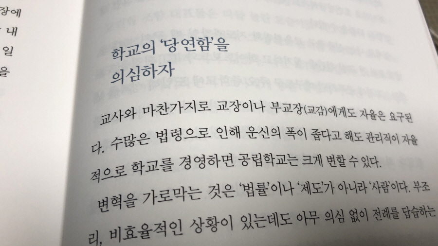 학생들이 학교에서 "무엇을 배워야 하는가?"에 진심인 교사의 입장에서 거듭 고민하고 실천하는 사례들은 보는 내내 부러웠다. 하지만 한편으로는 학교가 바뀐들 부모나 사회, 교육 시스템이 바뀌지 않는다면 이들의 노력 또한 부질없는 일이 아닌가 싶기도 하고, 또 입시제도가 인생을 가르는 척도처럼 시퍼렇게 날을 세우고 있는 현실에서 아이들에게 막연하게 교육의 목적이랍시고 섣부른 가르침은 되려 독이 될 수도 있지 않을까 우려되기도 한다.