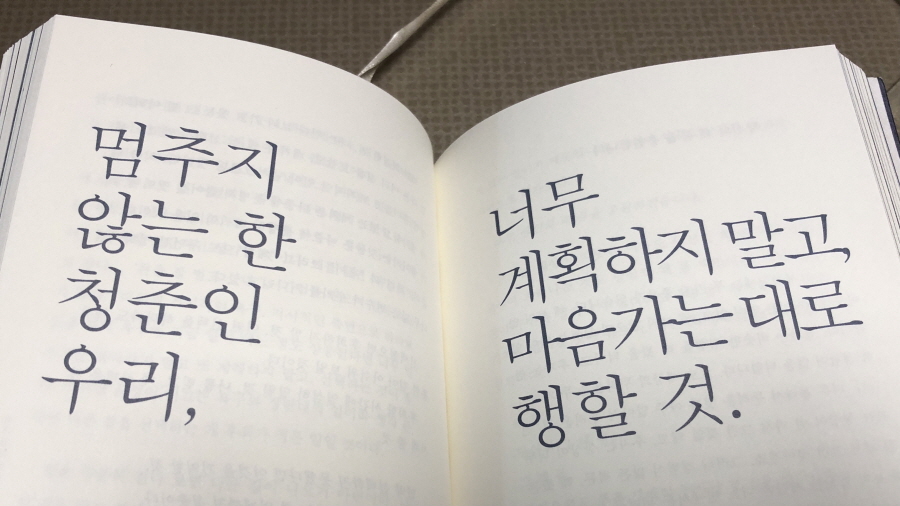 타이포그래피의 감각적 편집 디자인은 칭찬할만 한데 글자 크기는 애로적이었다. 불편해서 안 쓰던 안경을 다시 써야 했고 같은 문단을 반복해야 해서 읽느라 리듬도 깨졌다. 독자에 대한 배려, 좀 부족했다. 나만 그랬을 수도 있겠지만.