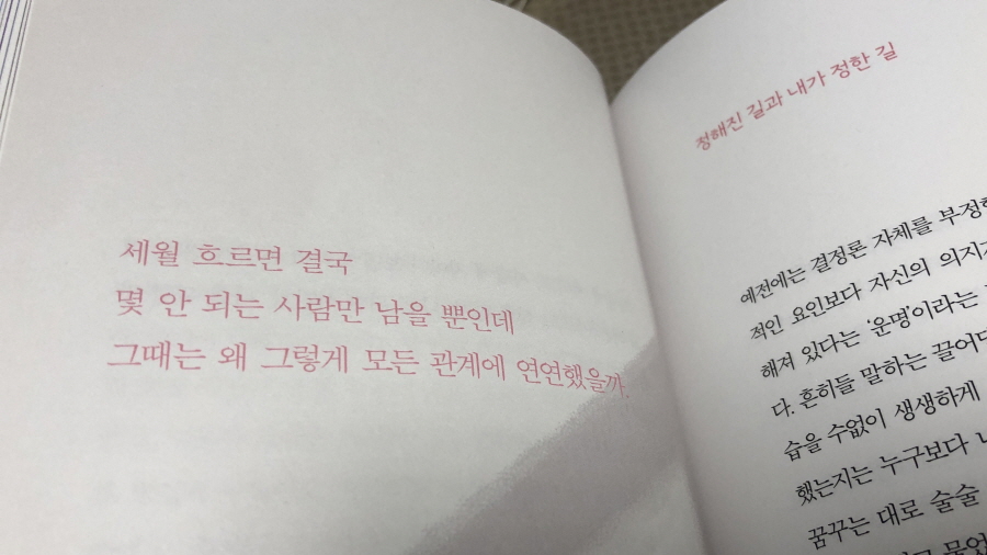 왜 이 문장에서 한참 머물렀는지 알 순 없지만, 유한한 시간이 느껴져 그랬던 건 아닐까. 눈부실 만큼 아름다운 것들의 소멸이 주는 허망함이 짧은 문장에서 우리 삶이 사랑이 그러할지도 모르겠다는 생각이 들었다.