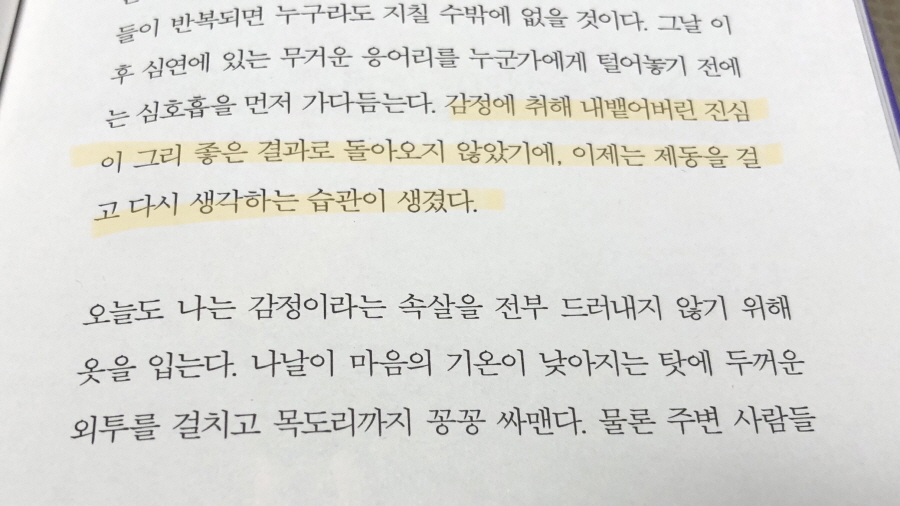 작가에 글에 빠져 이렇다 할 생각을 하지 못하고 책장만 넘기다 나 역시 솔직하려다 되레 서로에게 상처를 입히고 너덜너덜해진 마음에 자주 후회하는 탓에 마음이 평온하기 쉽지 않다. 그런 작가의 심경을 생각하니 눈가가 그렁해졌다. 아마 더 이상 마음 여는 일이 쉽지 않을 테다. 내가 그러해서.