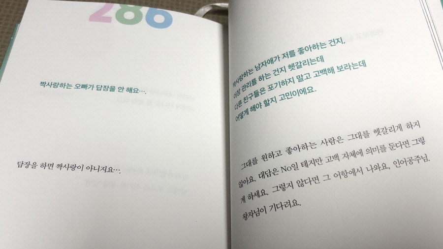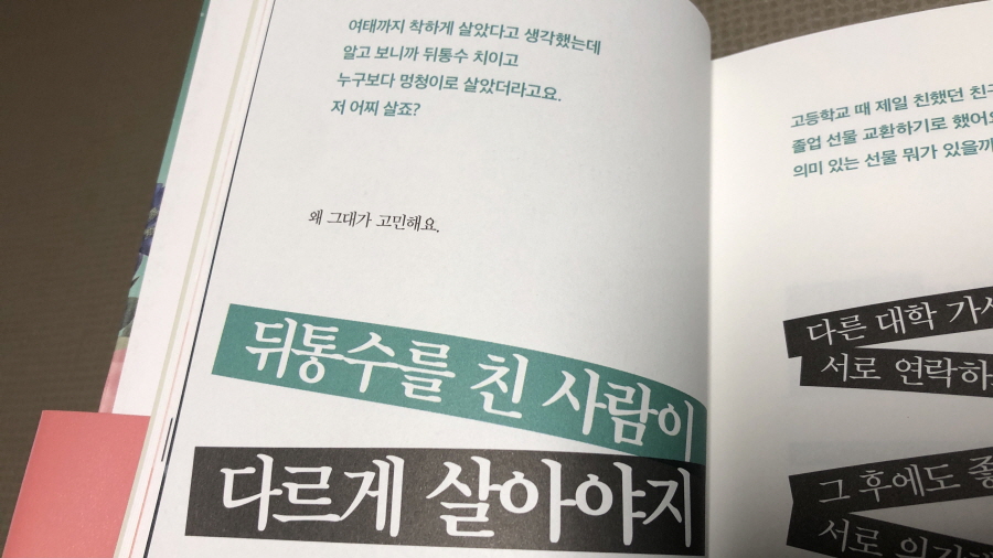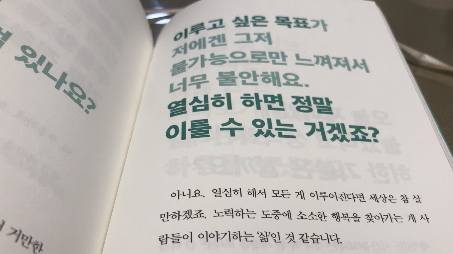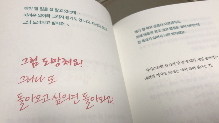 누구나 한 번쯤 깊은 수렁에 빠졌다고 생각할 때가 있지 않을까. 만약 지금이 그때라면 이 책이 위로와 힘을 슬며시 밀어 주는 것 같을지 모른다. 그리고 더 마음에 들었던 이유는 팬과의 소통으로 그저 뻔한 소리에 공허한 위로만 하는 게 아니라 지친 마음을 다잡고 진짜 자신의 인생을 사는 게 중요하단 '찐'한 공감을 준다는 데 있다.
