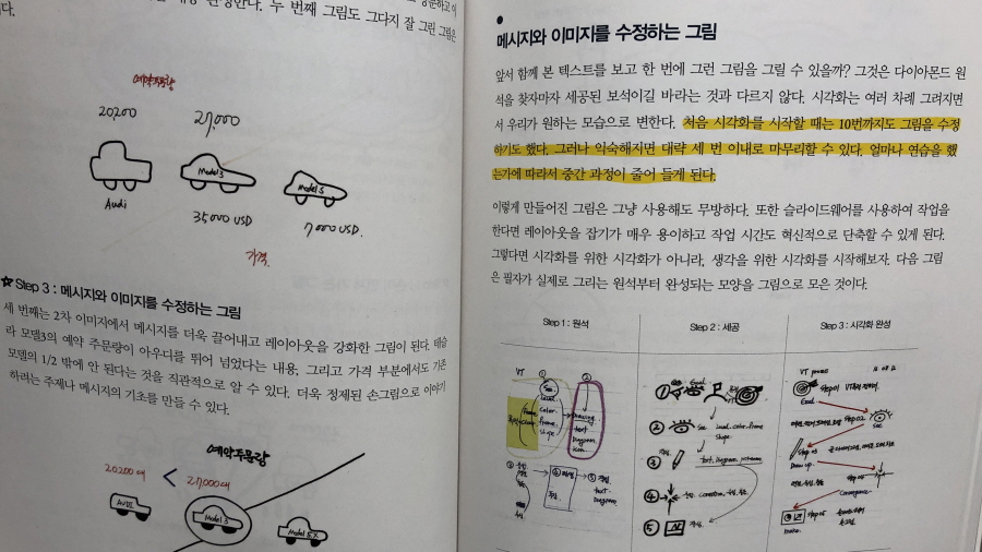 처음에는 머릿속을 떠도는 생각들을 그림으로 의미를 전달하는 방법이라고 생각했는데 저자는 기본적인 메모에서 시작해 수정을 거듭해 텍스트와 그림을 적절히 조합해 비주얼 씽킹을 완성한다고 설명한다. 단순히 그림으로 표현하는 정도로 그치는 게 아니다.