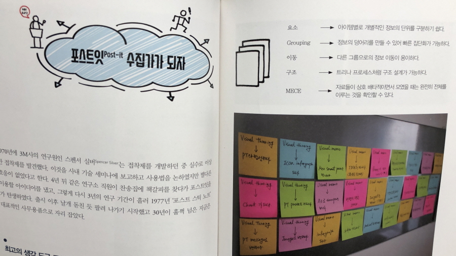또 한편으로 포스트잇을 활용해 생각의 연결과 그룹, 구조화를 하는 방법을 소개하는데 이런 방법은 연수나 세미나에 종종 등장하는 것이라 낯설진 않은데 이런 방법도 비주얼 씽킹이었다는 건 몰랐다.