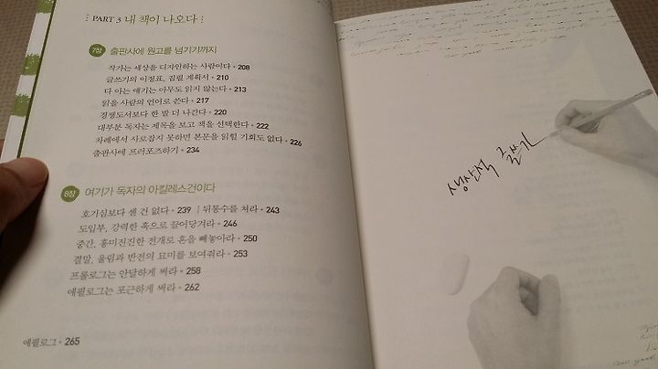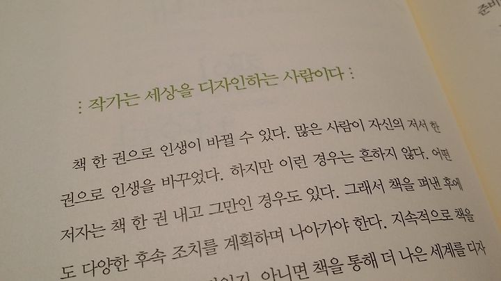 그러다 우연히 정말 우연히 이 책을 보았습니다. <생산적 글쓰기> 오오 거기다 삶을 변화시킨다니 이 책의 내용이 정말 궁금했습니다. 사실 작법에 대한 책이 이렇게 다양하게 있는지도 몰랐었네요. 아무튼 관심이 많은 분야였던터라 제목을 보자마자 집어들었습니다. 책 내용은 솔직히 생각했던 작법에 대한 팁이나 스킬을 이야기 한다기 보다 진짜 글쓰는 이유와 계획, 글쓰는 방법, 거기다 출판에 이르기까지 작가의 다양한 노하우를 풀어놓고 있습니다. 헌데 읽다보니 작가는 글쓰는 방법을 이야기하는데 약간 어불성설 아닌가 싶은 부분이 있어요. 데드라인을 정해놓고 출판기념회를 정하고 널리 알리고 예약까지 하며 심리적 압박을 스스로 부여하라고 코치하다가 바로 뒤에는 '즐기면서 쓰자'는 이야기를 하는데 '저렇게 머리를 쥐어뜯을 정도로 심리적 압박을 해야하는 글쓰기가 즐거울 수 있을까'라는 생각을 하게되네요. ^^;